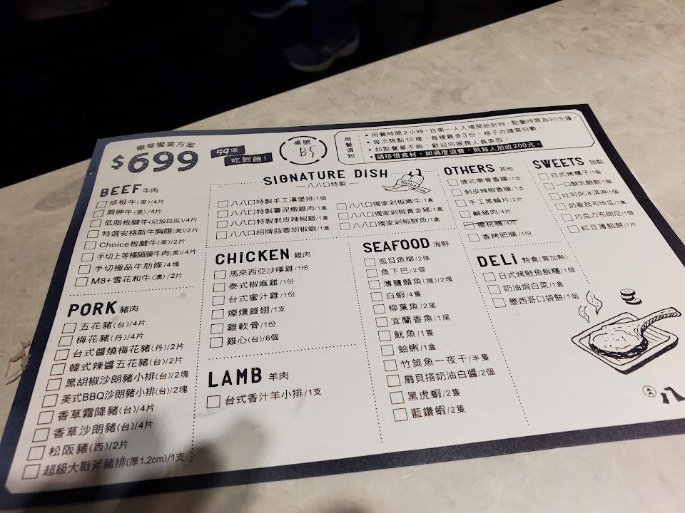 這次選擇最低價位$699的,選項不多一次最多點三份,送來一次性的量有點偏少,需在加點,沙拉吧都慢乾淨的,醬料及飲料有很多可選擇,但烤肉肉品味道比較偏淡,需在另外在醬。