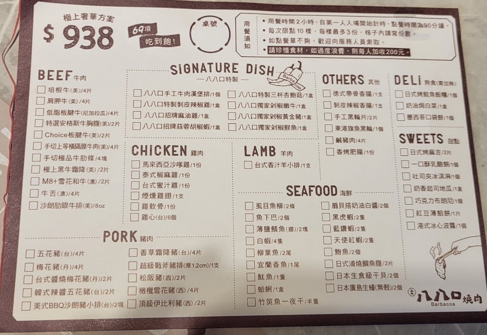 點餐是用劃單的方式,一次可以劃十樣餐點,想吃還可以再加點,用這種方式可能是怕浪費食材,浪費要再付食材費