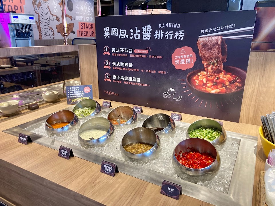 自助吧有季節水果、蔬菜、醬料、飲料、冰淇淋、白飯等,冰淇淋跟飲料的選擇多樣、豐富,醬料也有幫忙調配好的