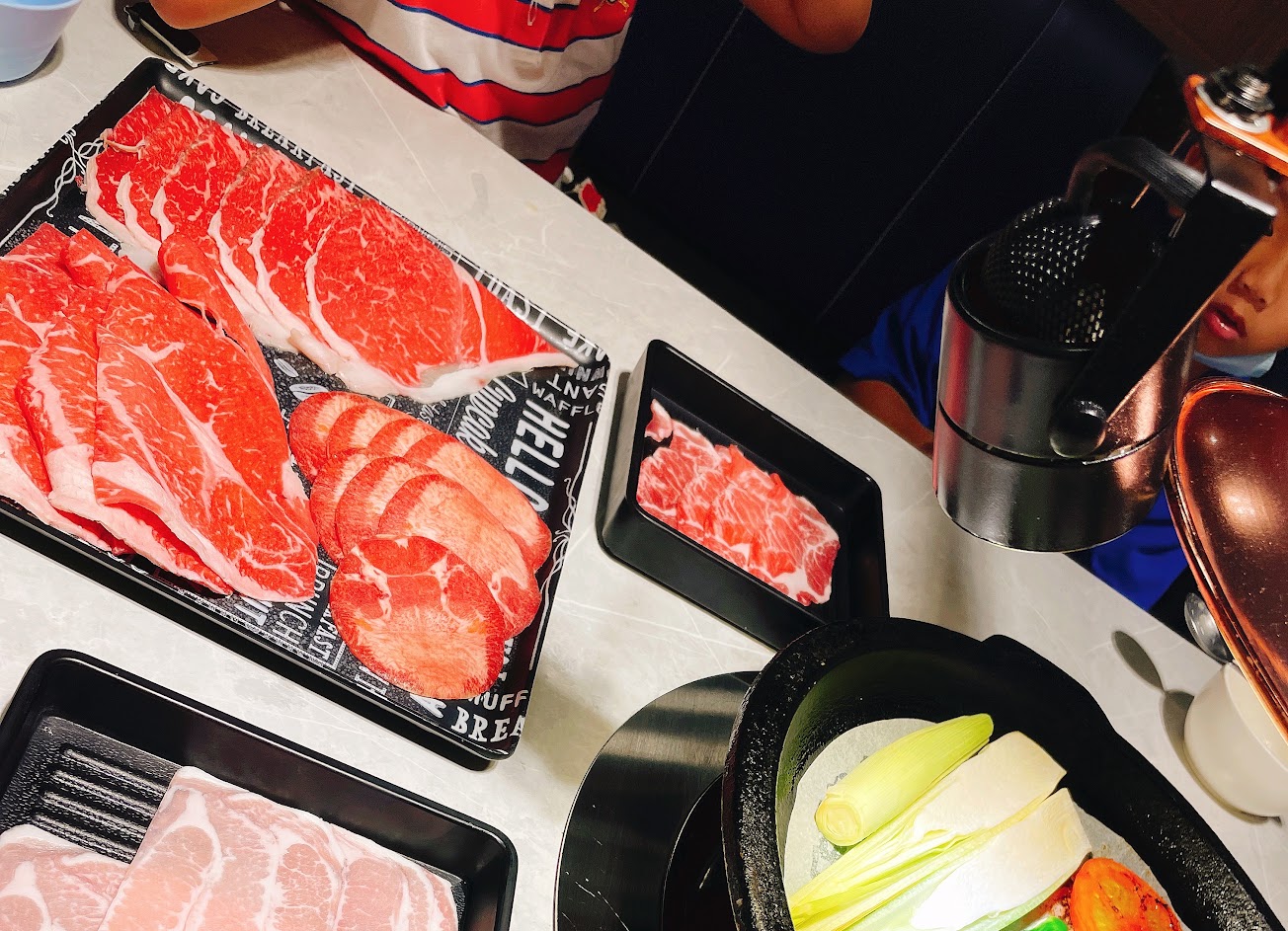 桌上擺滿各式肉品 蝦 干貝 咖啡 茶飲 火烤鍋中烤的油滋滋