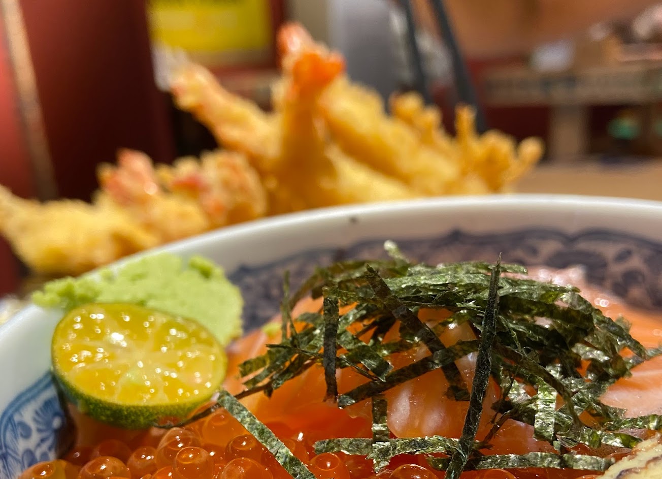 鮭魚丼、蛤蜊味增湯、生魚片和炸蝦手卷壽司都很好吃!