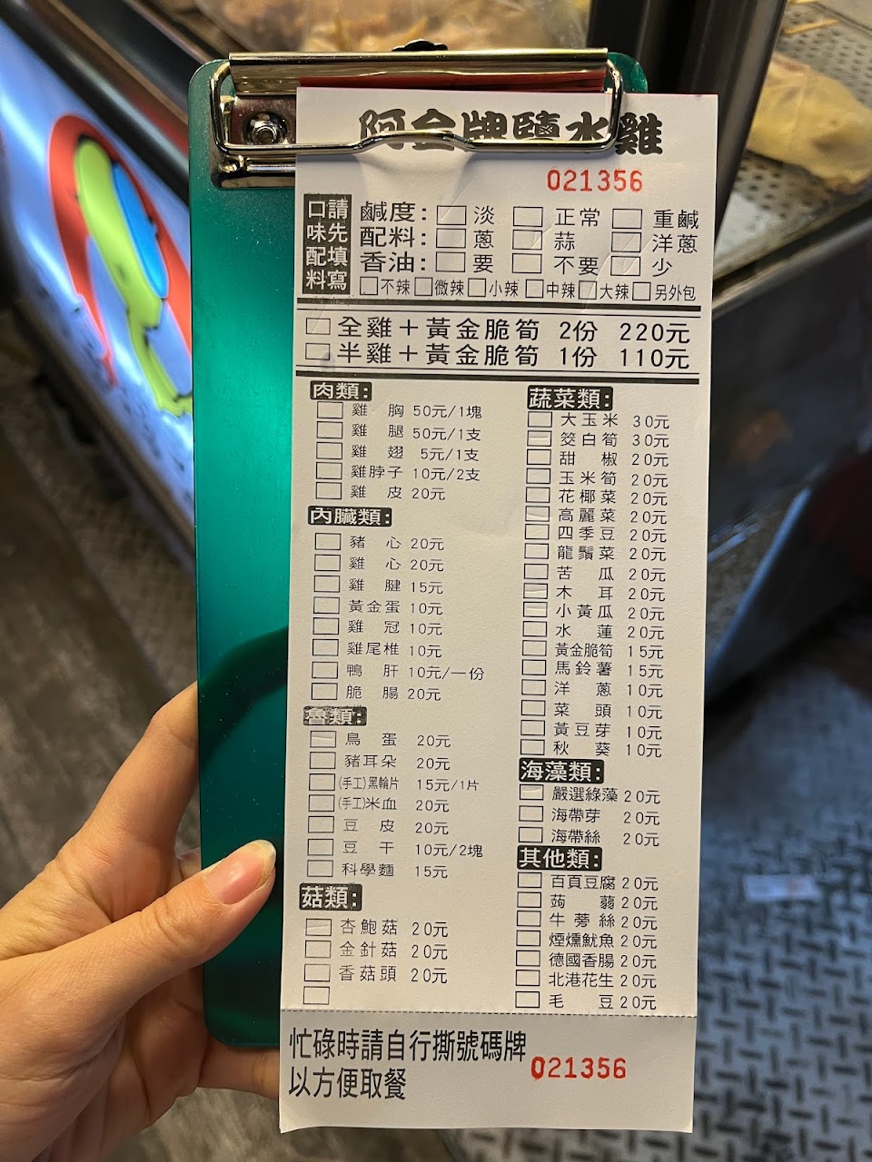 鹽水雞的菜色選擇多樣,雞肉就有分雞胸、雞腿、雞翅的部位可以選,當然也要搭配蔬菜,建議可以先打電話來訂,因為我在現場等了15分鐘左右,口味配料可以自行選擇要不要加蔥蒜、洋蔥,整體吃起來還OK,但就是單價高份量少。