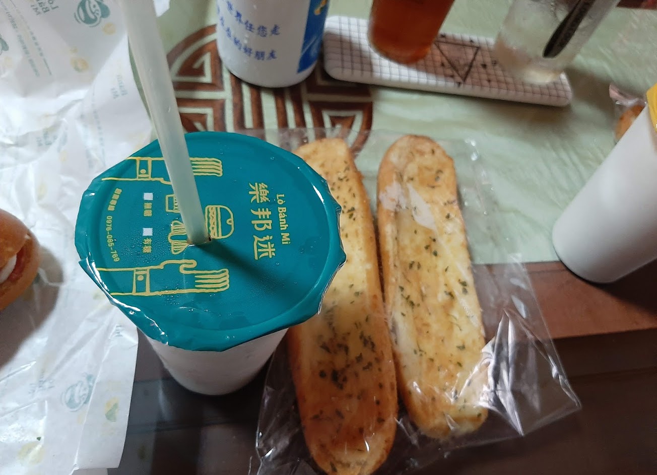 越式麵包原本就是偏硬需要咀嚼的口感,個人非常喜歡!店內除了有短棍還有圓法!很特別~ 今天點了1.越式經典總匯短棍(超推薦!)食材用料新鮮,而且真的很道地! 2.鮮蔬醬燒雪花牛圓法,一樣用料新鮮!!洋蔥比較生(但我很愛? 3.香蒜麵包~一樣是比較硬的口感喔~香蒜超級香!!一樣推推~麵包吃不完也能直接帶走?包裝很方便 4.太泰奶茶,甜度適中~也有茶香~ 5.打卡送的西貢冰茶(無糖)這杯就比較澀,個人不喜歡~