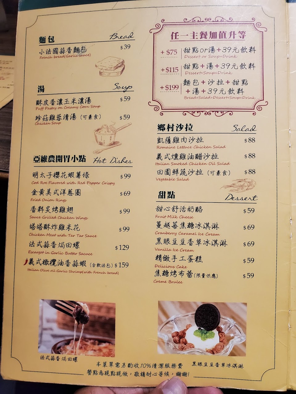 海陸披薩,瓦片牛肉,烤全雞,白醬培根義大利麵,黑眼豆豆冰淇淋,氣泡飲必點
