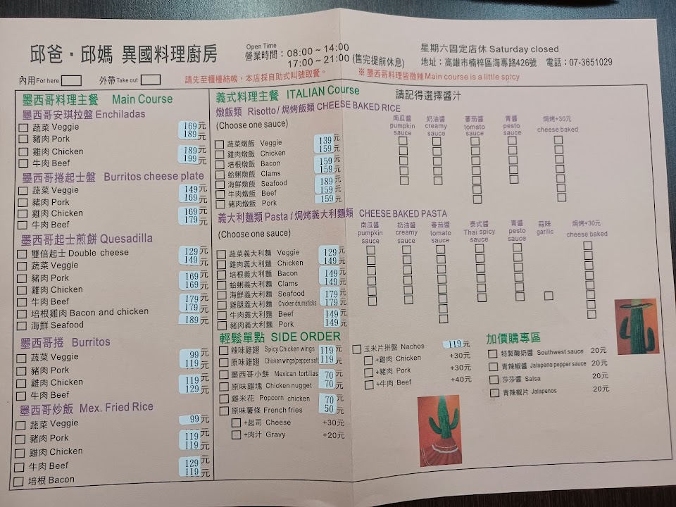 N訪,用餐位置於楠梓加工出口區與高雄(海洋)科大校區附近,用餐環境舒適,雖然店面不顯眼與沒有華麗的裝潢,週邊停放汽車較不便利,但料理口味特別,僅提供現金消費,餐點主要提供墨西哥料理和義式料理兩種,店內座位不算多,有冷氣用餐空間,提供免費茶飲和湯類,當天點墨西哥安琪拉雞肉盤,醬料口味特別偏酸甜搭配雞肉捲好吃,飯類口感微辣,整體非常喜歡!墨西哥牛肉捲餅,餅皮口感實在,搭配墨西哥醬料與牛肉,爽口且好吃。店家有經營facebook 粉絲專頁,提供優惠訊息與店休公告,避免白跑一趟…