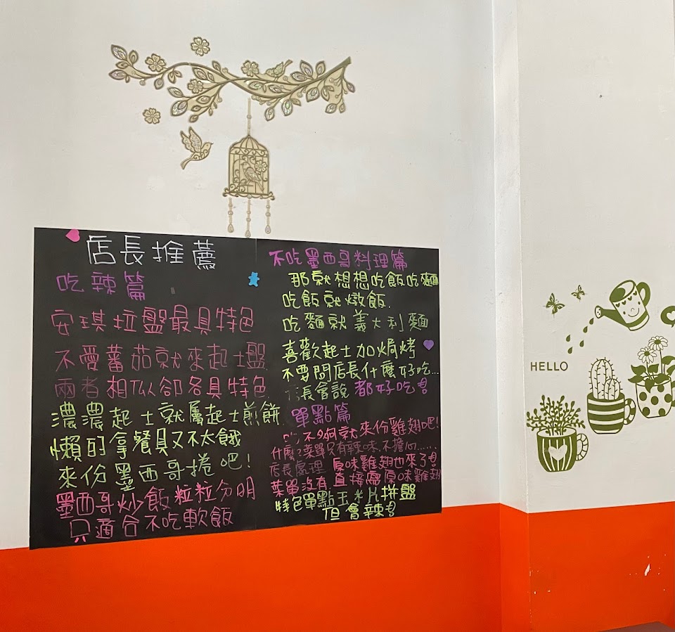 異國料理餐館,內用環境整潔,番茄義大利麵好吃,墨西哥炒飯太乾口感不佳,自助湯品為台式菜頭湯,簡單好喝,整體價位一般。