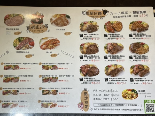 自助吧種類繁多可任選,牛排品質優良,工作人員也會告知牛排是有筋或沒有筋 出餐速度快 是在地熱門餐廳