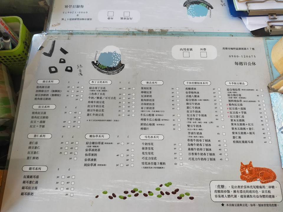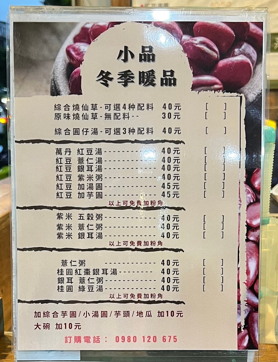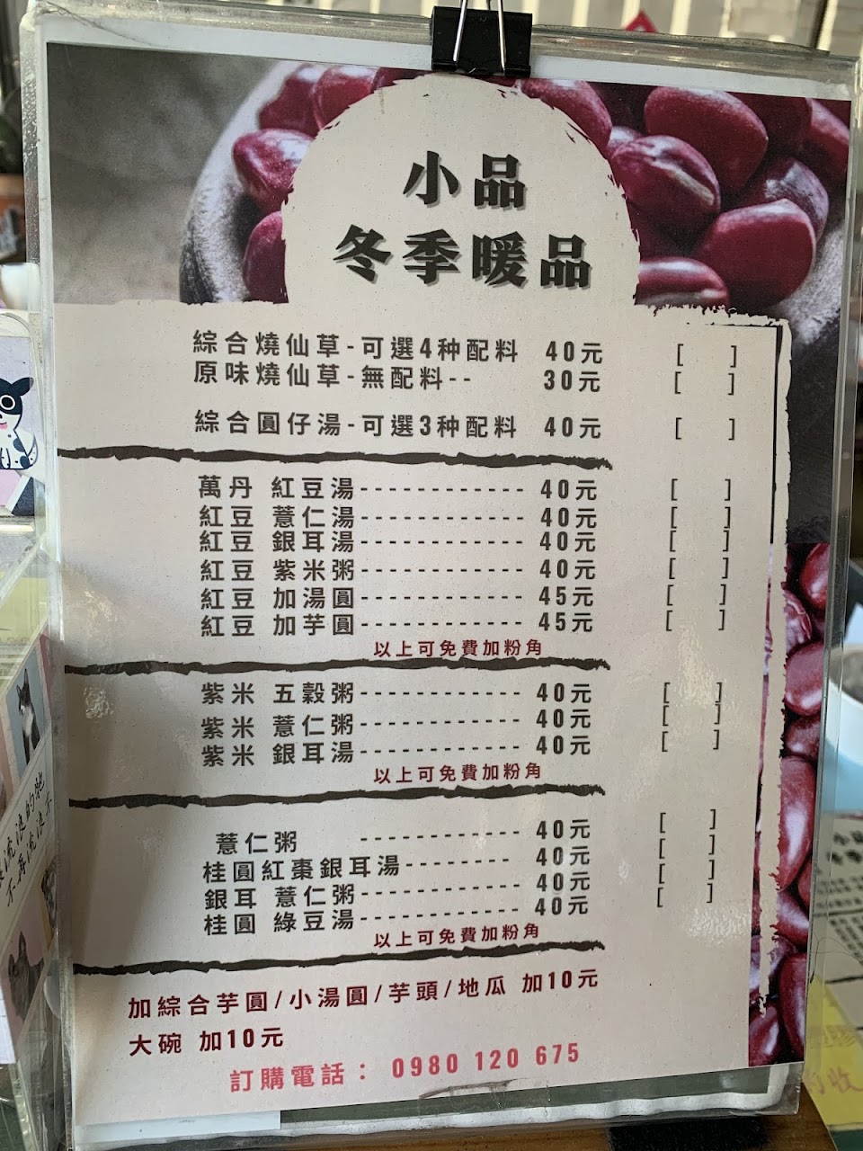 我:(原本想點嫩仙草,看了配料後)不用,(後來抬頭看菜單,詢問是否還有紅豆湯)那點一杯紅豆湯