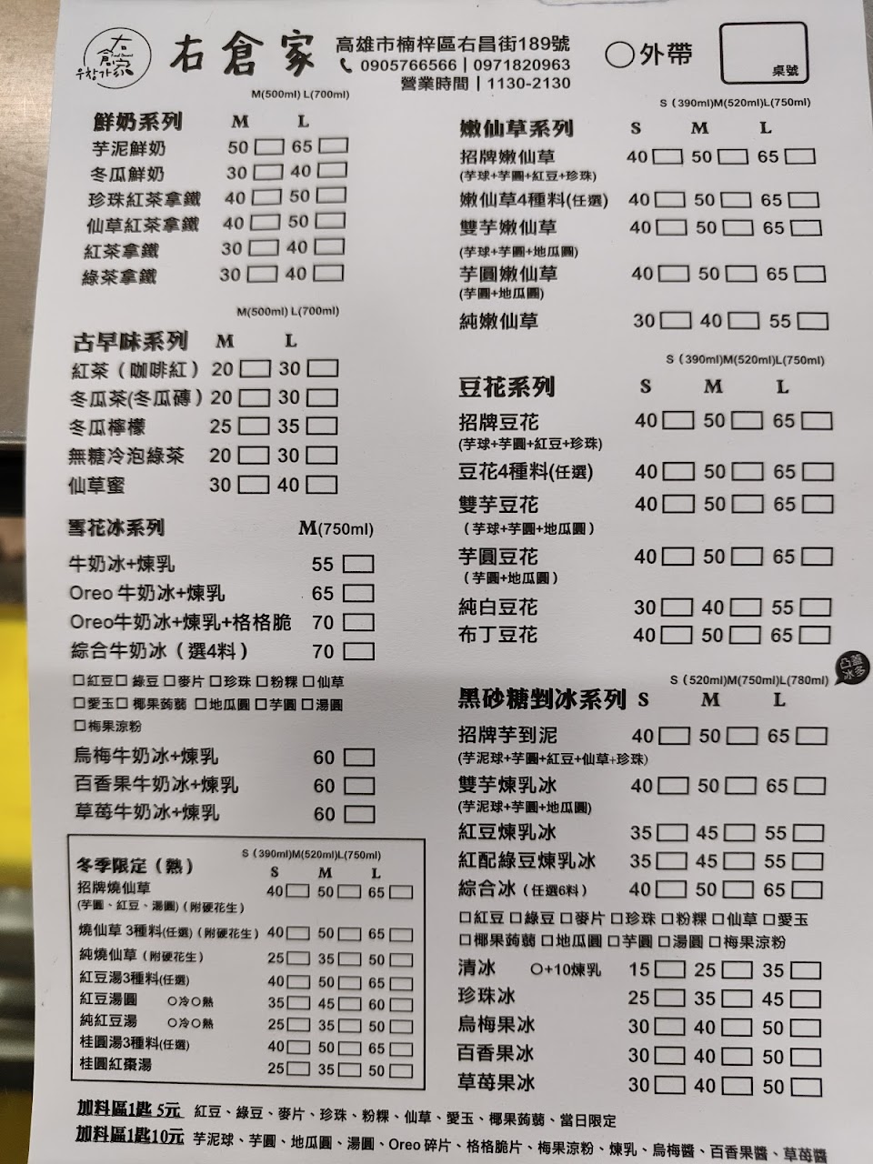 2024最新在地推薦餐廳的菜單_右倉家甜品屋-招牌燒仙草/冷熱紅豆湯/綜合桂圓紅棗甜湯/紫米紅豆粥/嫩仙草自選料/傳統白豆花/雞蛋布丁豆花/16種料可任選/青草茶/(紅豆)(綠豆)薏仁湯/古早味紅茶/珍珠仙草奶茶/冬瓜茶/冬瓜檸檬的菜單、圖片