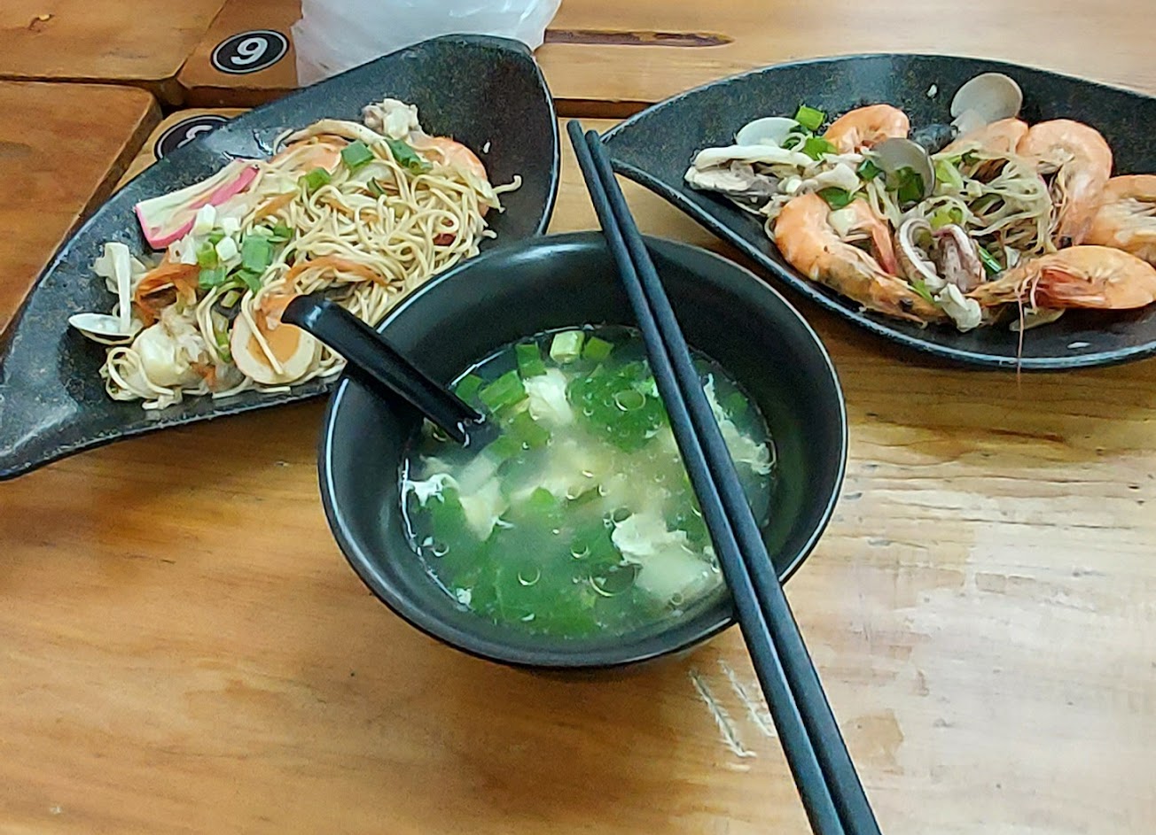 炒麵有鑊氣,可惜豬肉片口感像組合肉。鹹蝦平價好吃夠味,海鮮湯料足味美加筍絲。