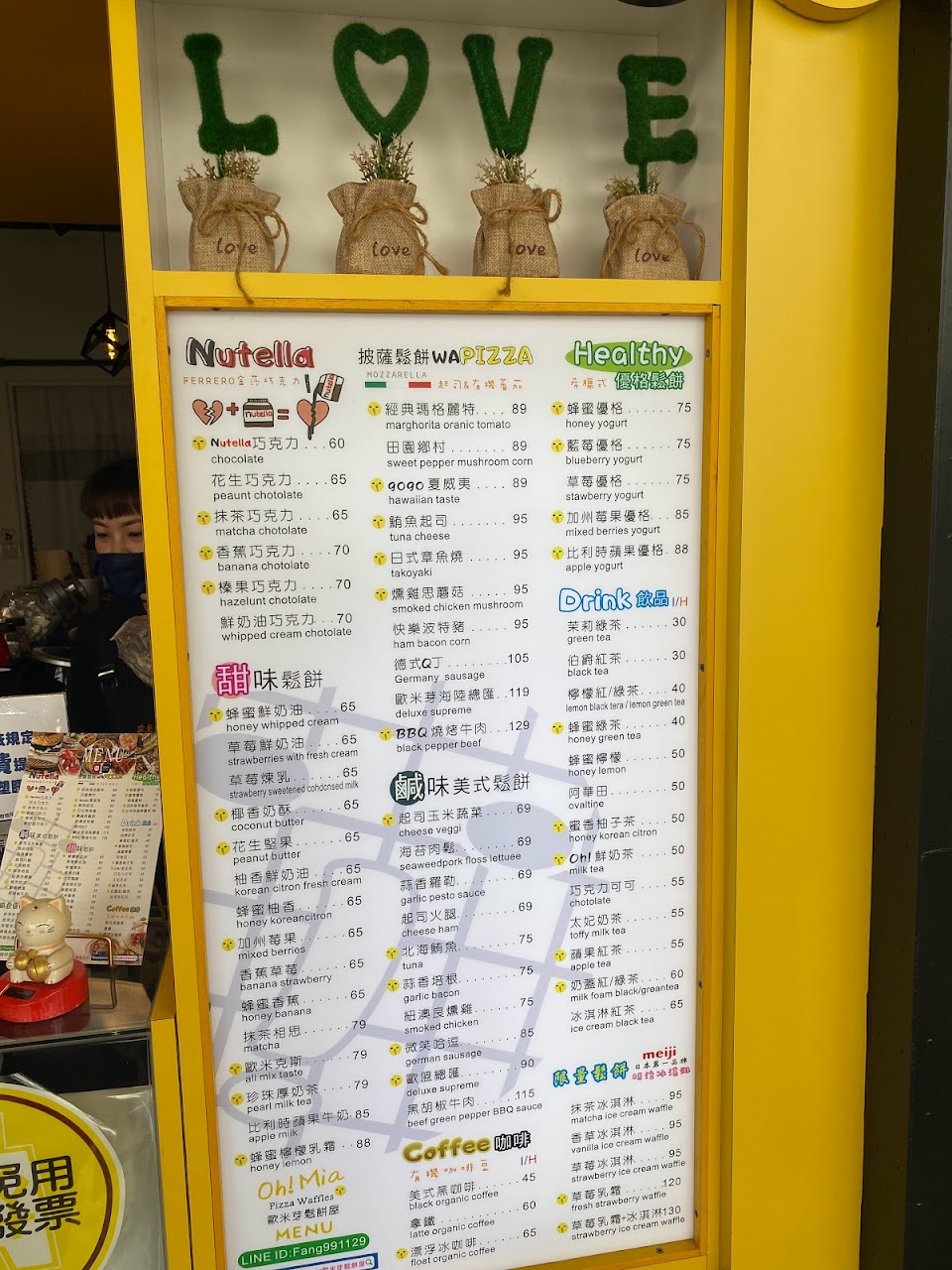 有自創的披薩鬆餅、有冰淇淋鬆餅、也有一些飲品,鬆餅只能現場製作不能先預烤,不想等的人可以用點餐APP或先打電話訂餐