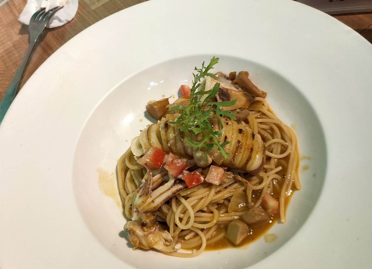 此次用餐皆為義大利麵,不難吃,但料理手法欠佳,有點亂配,例如墨魚麵配茄汁,整個失去墨魚麵的口感。我建議回歸食材的原味,把層次做出來就很美味。