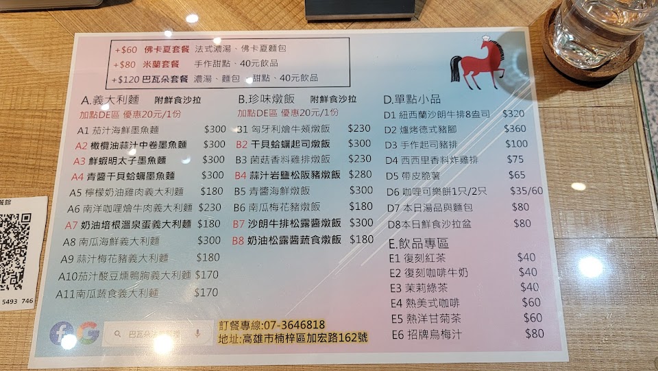 價格偏高,套餐的價格也是偏高(但加巴瓦朵套餐的話,主餐可以免費加麵/飯)