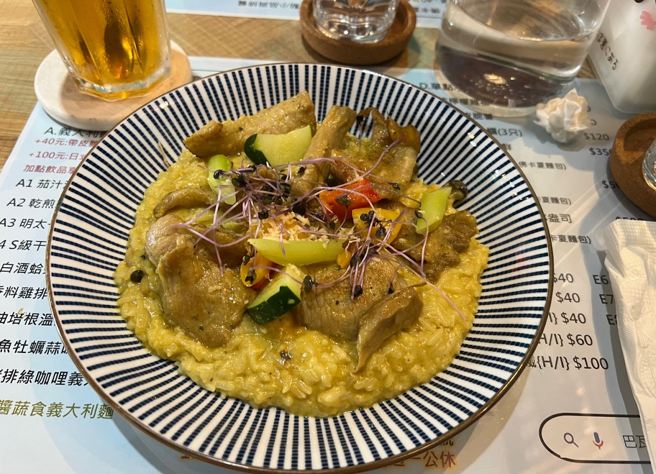 餐點超級好吃,今天點了南洋綠咖喱松阪豬燉飯加135元的巴瓦朵套餐,每一樣餐點都有一定水準,外場人員服務親切,介紹餐點簡潔明瞭,非常優秀,會想再訪,推薦。