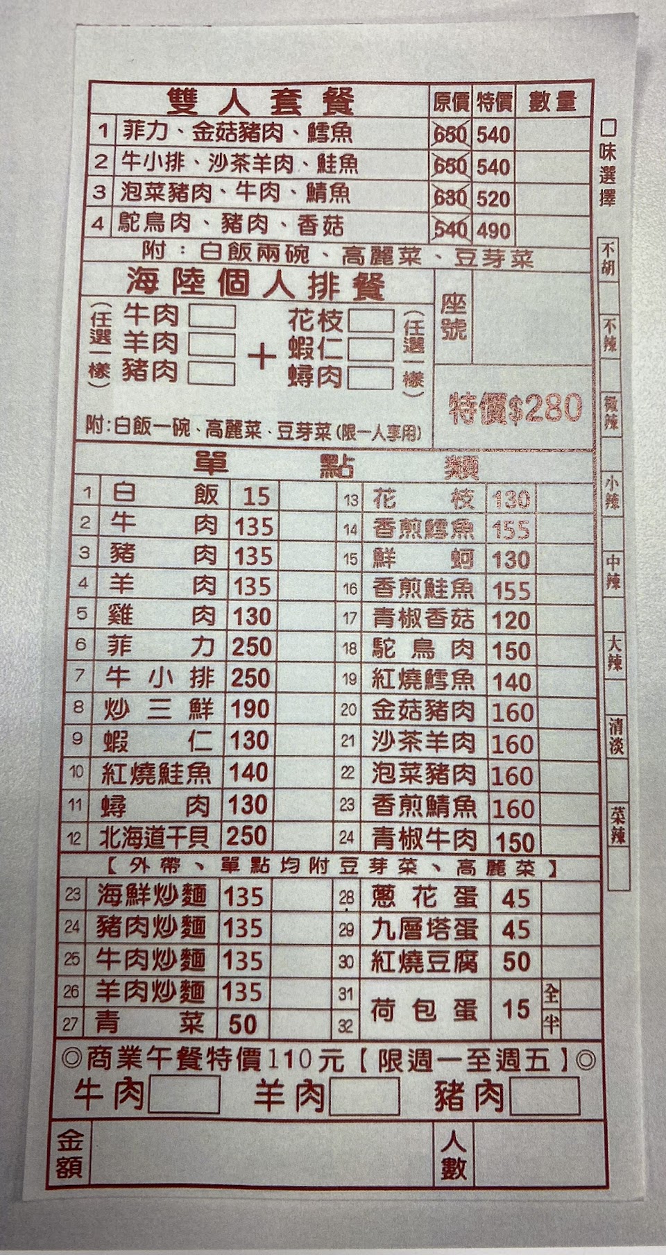 平價的鐵板燒,內用需要加收服務費(白飯一碗費用)。
