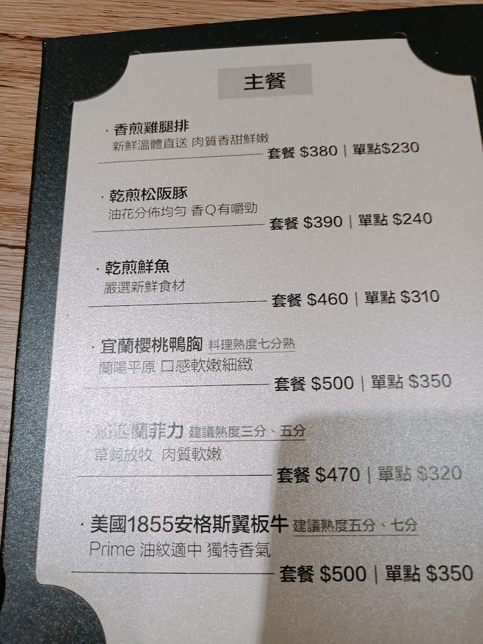 用餐前精闢的解說,老闆不疾不徐的看客人的用餐速度上菜無縫接軌技術優質,餐點全部吃完很有飽足感,菲力五分好吃口感優!