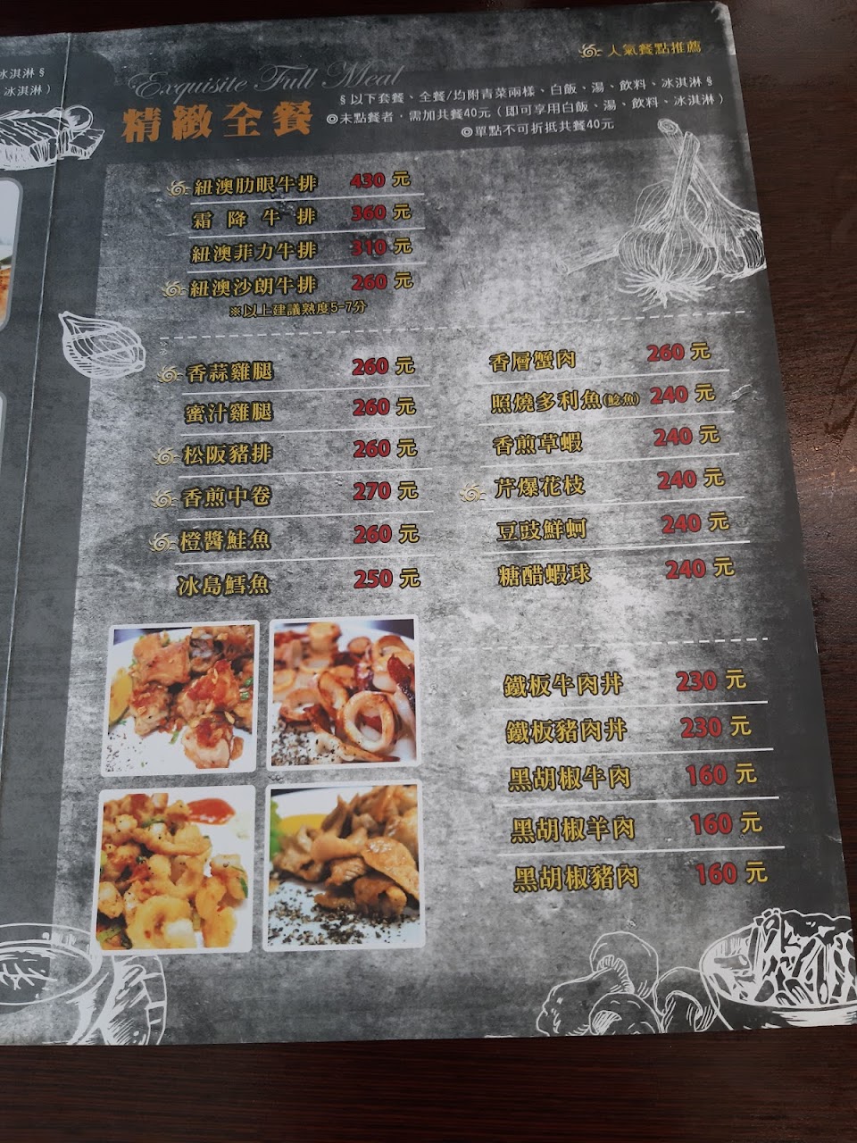 份量很多,口味也不錯,飯湯飲料冰淇淋吃到飽,香蒜雞排220元(原味)很好吃,黑胡椒牛肉150元,羊肉+蔥蛋+多利魚套餐230元,都有附上一大盤的2種炒青菜,如果女生吃真的會太飽,這邊共餐加40元,如果食量不大或有小孩可以選擇點套餐+共餐,