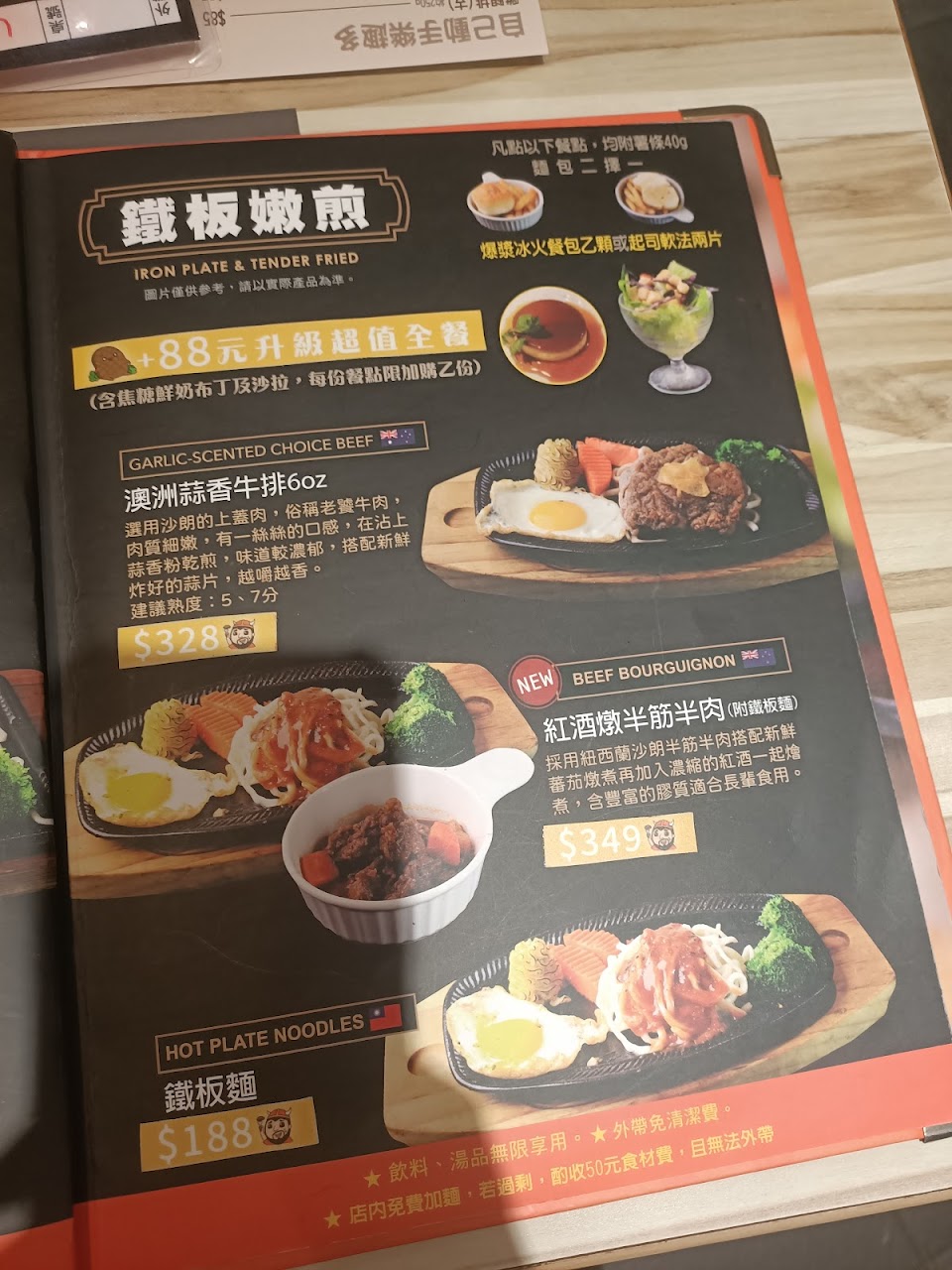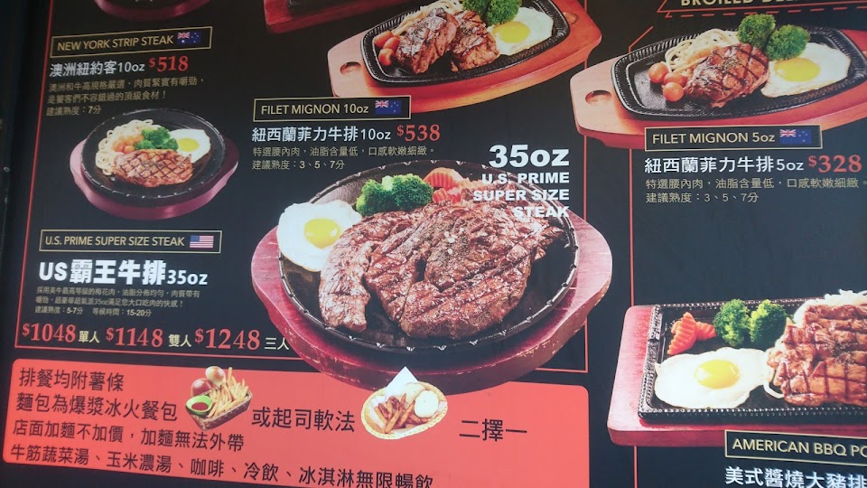 有麻辣燙,霜淇淋,湯類免費取用,隨餐有一個餐包跟薯條,一人低消188,價位類似連鎖x家牛排