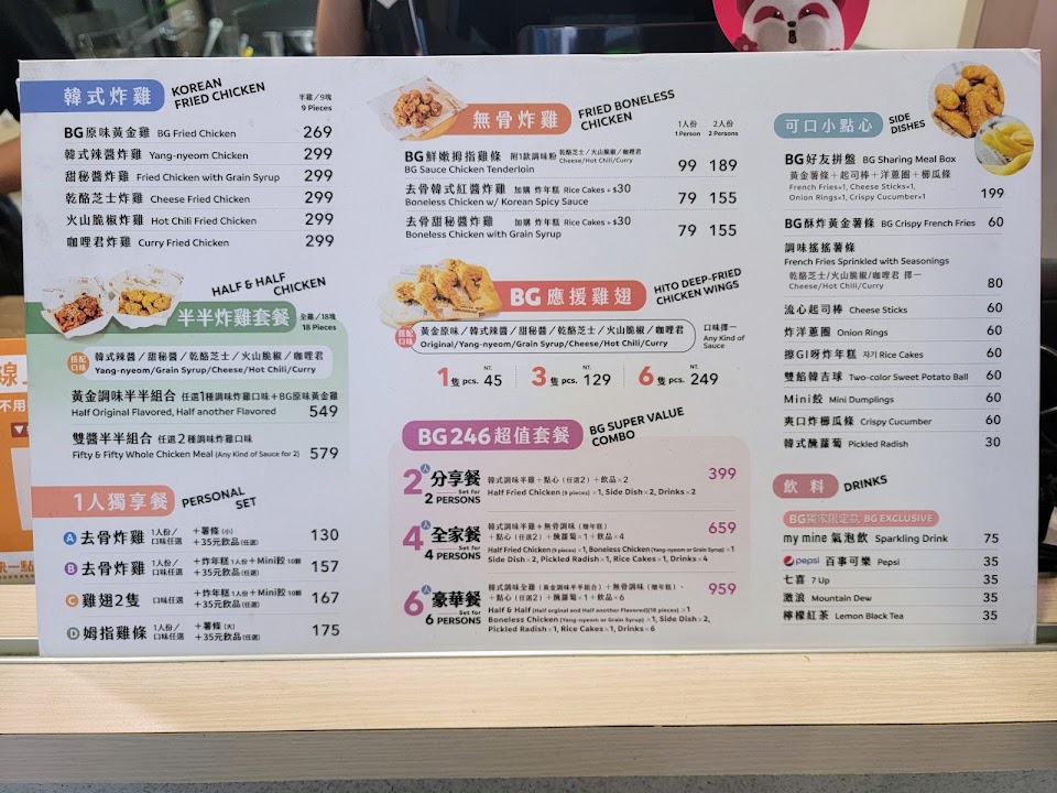 韓式辣醬炸雞:299元 招牌必吃必點? 滿滿半雞九塊韓式炸雞不油不膩? 現粿粉現炸現調味的韓式炸雞,10分鐘創造出美味 希希對韓式炸雞的印象是偏甜,開始吃好吃,吃到第二根時就開始覺得膩,而且冷掉很不好吃? 而BG chicken 的韓式炸雞外皮脆皮爽口,肉質軟嫩不柴,特製韓式醬料不甜不膩 現場吃不完外帶回家,連冷掉了都超好吃