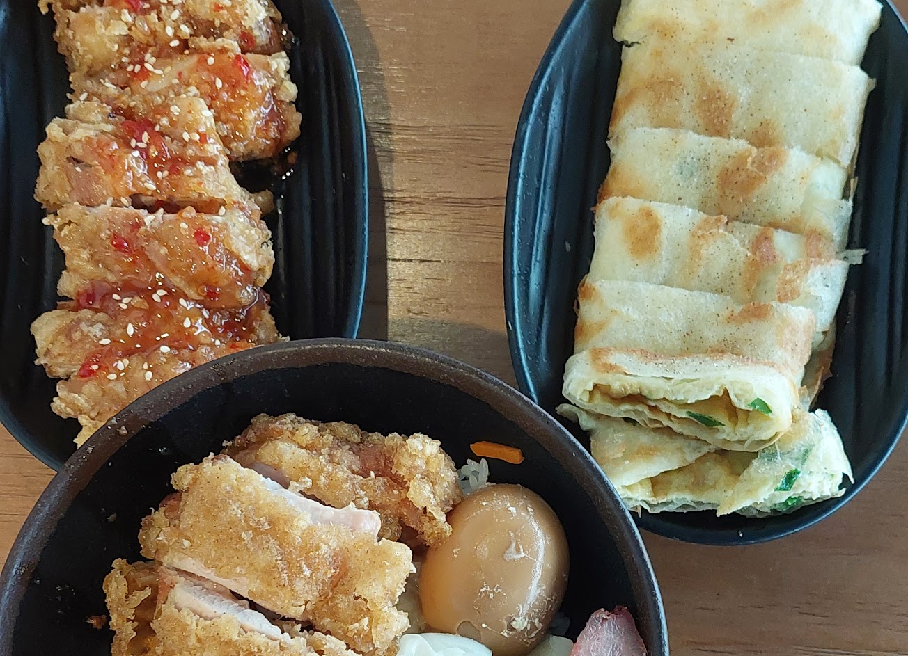 此次用餐點了椒麻雞飯($105)加肉燥(+$5)升級窩窩奶茶(+$15)共125元,以及吉利豬排飯($125)加肉燥(+$5)升級窩窩奶茶(+$15)共145元,以及九層塔脆皮蛋餅40元。