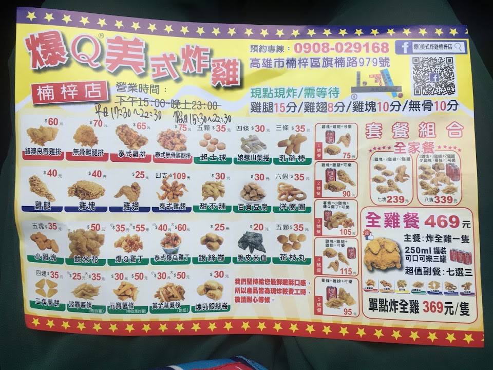 超好吃的!如其名爆Q! 真的是很Juicy~爆汁耶! 沒有油耗味! 吃起來口感NICE~ 超值全家餐超級超值! 炸雞薯條雞塊我全都要(愛) 超推!!!!!! 有很多分店但是目前吃下來, 比較偏愛楠梓店(讚 服務 外帶 餐點類型 晚餐 平均每人消費金額 $200-400 建議的餐點 超 好吃 的 雞 排