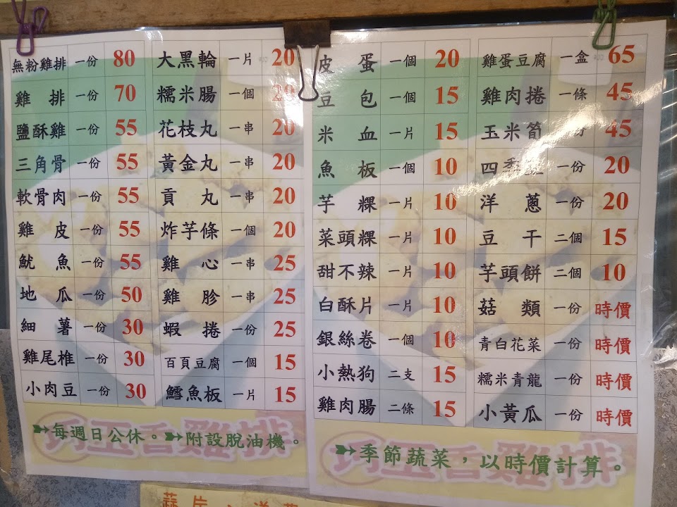 價位中等,不貴也不算便宜。推薦香雞排~~份量算滿多的,肉不會柴,很嫩很好吃!已經來買過兩次了,下次想吃香雞排的時候會特地想來這裡買!