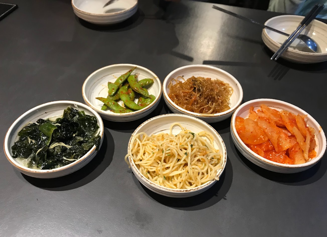 點鍋類會附上石鍋飯一份,五種小菜,小菜可無限續。小菜精緻度不錯,可惜飯非常慢,小菜都吃光一輪才終於有飯可配。整體服務都不錯。肉類的份量不少,豆腐鍋的料也不少,泡菜、蔬菜的量也不錯,火鍋的調味也剛好。