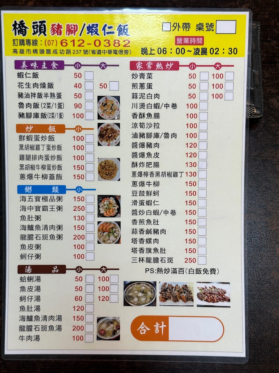 花生肉燥飯:將花生一起放進肉燥的滷鍋一起燉煮,肉燥多了花生的香氣,主題味道依然還是南部肥肉派的滷汁氣息,蠻好吃的,不會覺得膩。 海五寶極品粥:內有三隻蝦子、小卷、魚肉、蛤蜊、蚵所組成,同時搭配青蔥、薑絲、油蔥酥等(應該還有大骨粉),湯頭味道豐富,搭配湯泡飯,蠻推薦。 店家蠻親切,位於橋頭省道旁,是夜間宵夜好選擇。 服務 內用 餐點類型 其他 平均每人消費金額 $1-200
