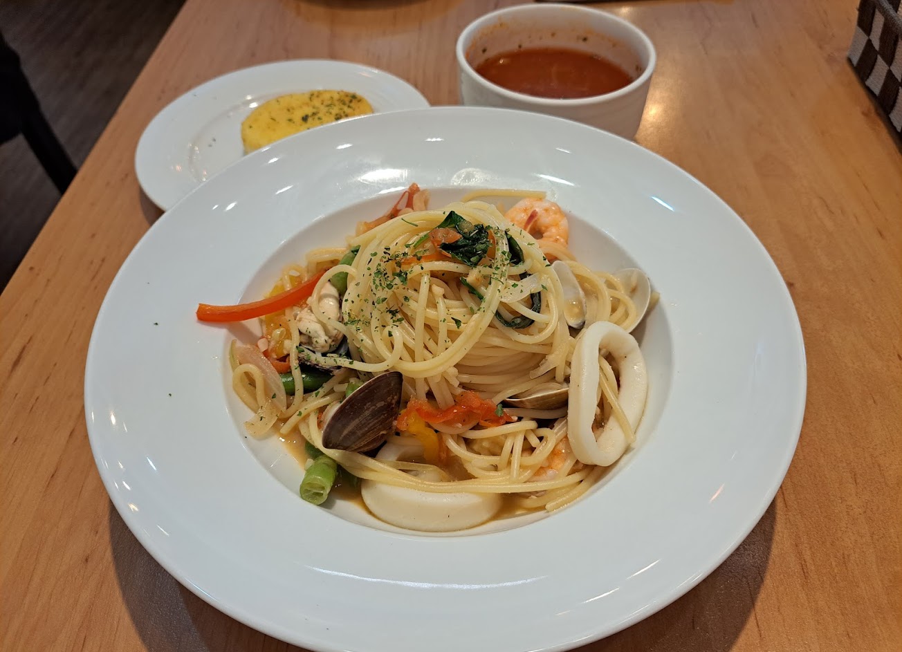 今天來品嚐香蒜海鮮義大利麵搭配1號餐(麵包+番茄蔬菜湯),口味很不錯,份量也很剛好,推薦給大家!