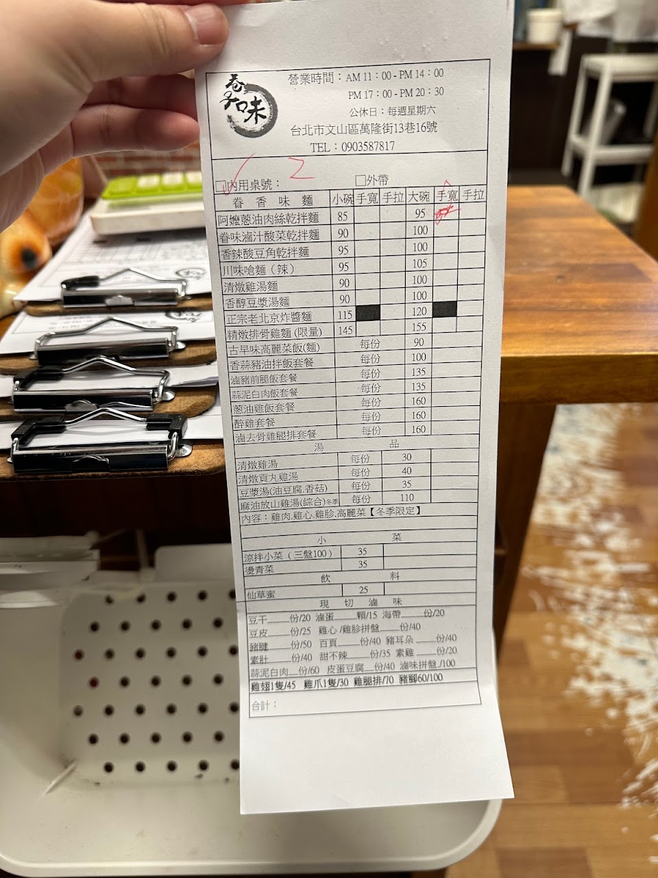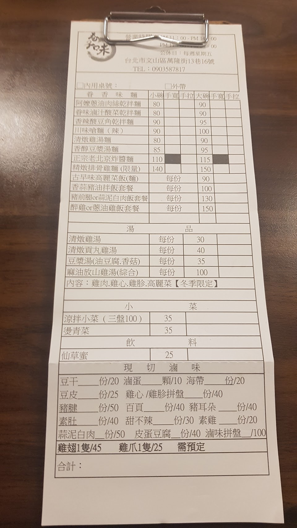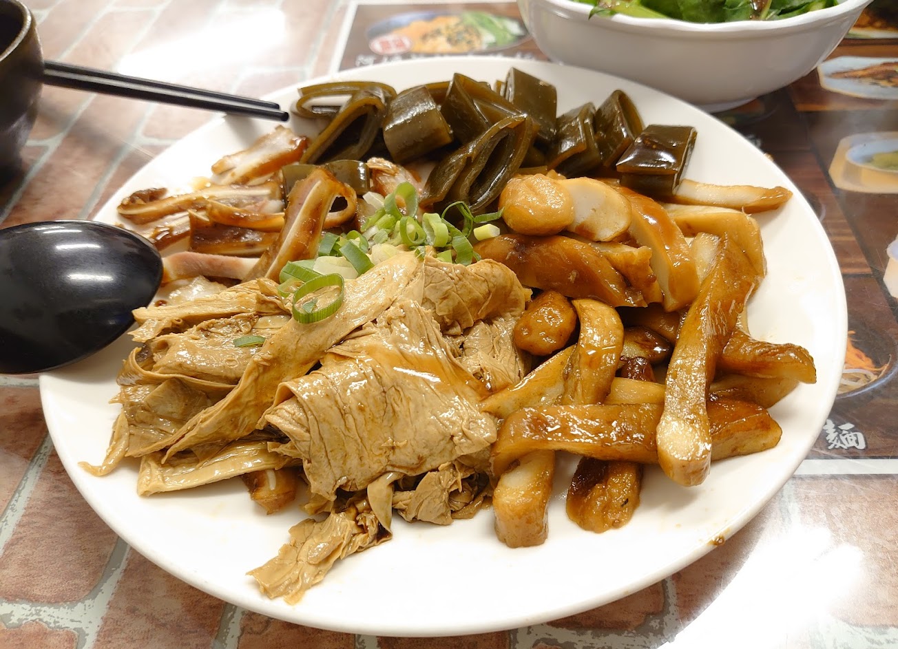 老闆、闆娘、闆媽撐起一家家庭式的小館,客人有獨食也有三代同堂的。飯麵都做得很用心,比一般麵店好吃些,也反映在價格上。切盤滷味中等但是滷雞爪真的很強:當天剛出鍋的,外表可見的烏骨雞、指甲處理乾淨,入口發現肉多、入味、用舌頭即可脫骨,一支30$可以回味很久。2023年4月週末晚餐