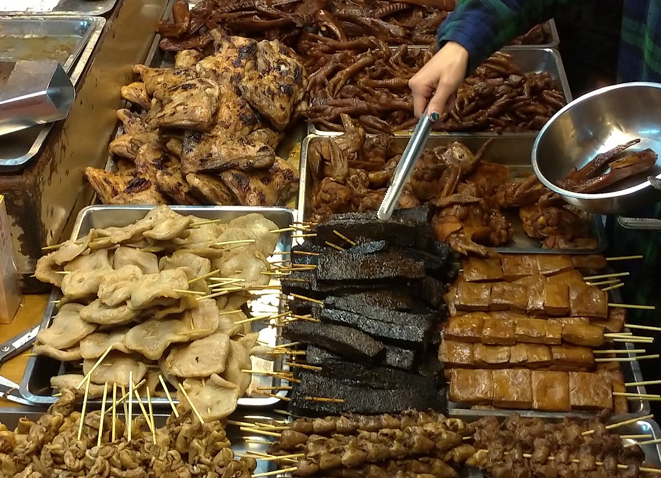常常大排長龍的一家烤肉店,味道真的不錯,酸菜腸子,雞腿,雞翅,甜不辣,豆乾,雞肝都很好吃,因為是魯過再烤所以炭烤的速度算快,點完餐後再去夜市晃一圈再回來時間差不多,平均等待時間約半小時。週一公休,18:10才開始營業。