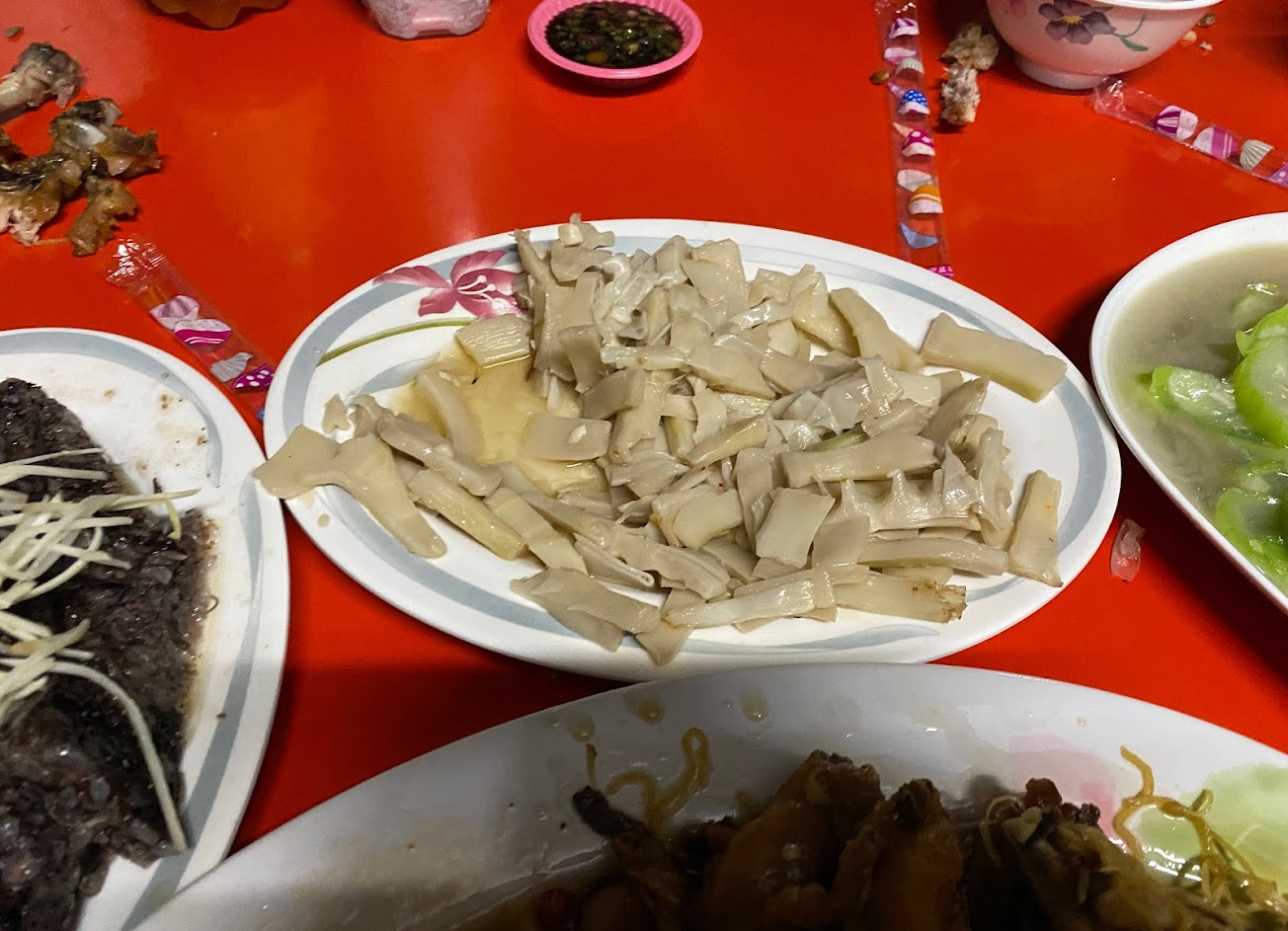 去那邊非常暗,店家養了一堆狗會一直叫但是都有拴起來 點了湯因為有蟲在飛有的還直接掉到湯裡 但是食物整體上都還不錯朴子蛋吃起來有點醬油炒蛋的味道 但是更香更好吃 白斬雞肉嫩 炸雞皮香肉好吃 但是三杯雞就有點差強人意太乾也太柴了 雞湯和剝皮辣椒湯都還不錯 高麗菜是用雞油下去炒的很香很好吃~搭配上店家的醬油味道很足 但是整體下來今天每道菜都油到不行不過是還不錯吃的 但是環境就昏暗蟲子也滿多的可能有些人比較不能接受