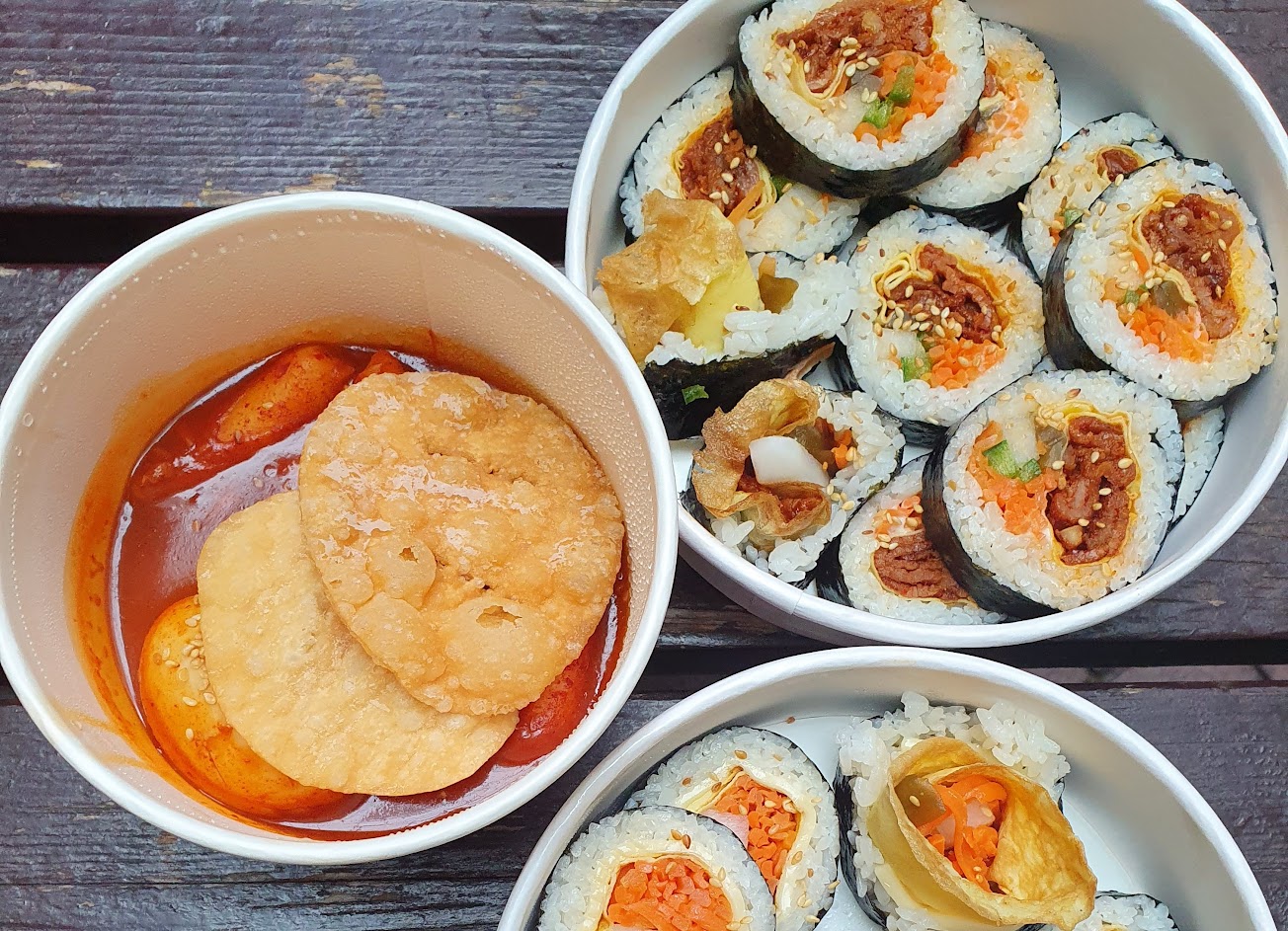 之前這間店剛開的時候,疫情正嚴重時期,只能外帶。當時買了韓式飯捲(這東西跟日本壽司我覺得是一模一樣的東西,只不過包的內餡彼此不同。但是,我相信你這麼跟韓國人說,他們大概整個那種隱藏或非隱藏的性格都會爆發出來吧?)覺得就是個清淡舒爽的食物,夏天吃吃算是OK的,就是信價比著實不怎麼樣,我可能吃過三五份以上,才會覺得這頓算是吃了個飽。