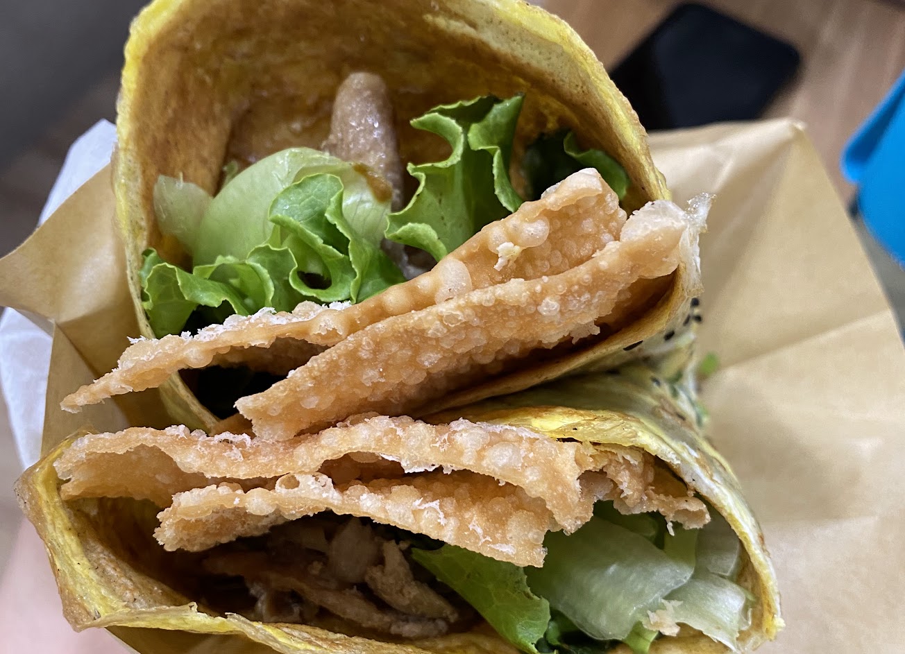 餅皮不是軟軟濕潤的那種,比較偏我喜歡的餅皮乾乾的煎餅果子類型,裡面夾的薄脆也酥脆好吃。
