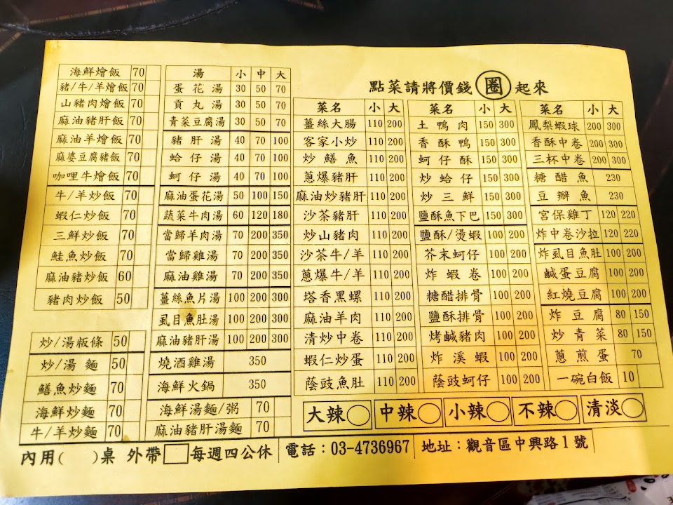 2022/08/09第一次來到觀音市區與朋友幾人吃小抄,點了燙生蚵*2、炸生蚵、薑絲大腸、三杯中卷、湯燙青菜及蔥煎蛋*2拿幾瓶啤酒配飯,是下班休息的一大享受。店家環境雖然不大,但東西還不錯吃。 廁所在地下室,因建築較老舊空間不大,所以做在地下室(我猜的)。 停車問題:周邊只要沒劃紅線,不影響人員出路,暫停一下應該沒問題。