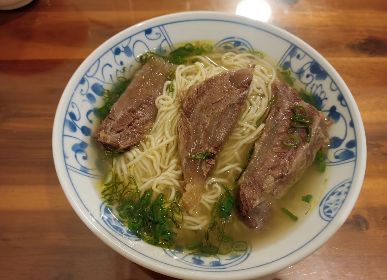 有三大條的牛腱肉,肉質軟嫩不柴,吃得到牛筋的膠質感,在牛肉麵隨隨便便都100起跳的時代,這肉量這價格還有冷氣可吹,真的很實惠。碗不大重點都是肉,可以續湯,湯喝第二輪時莫名比較鹹,喝得挺可。