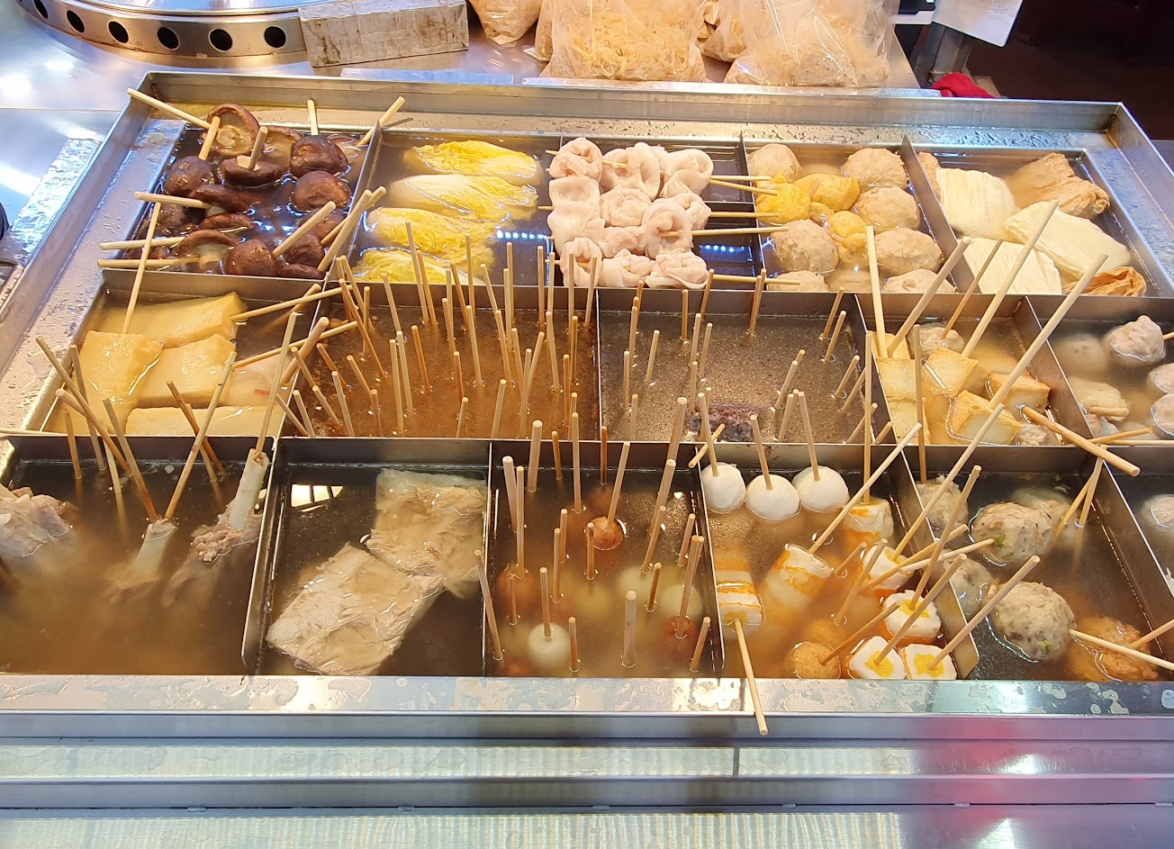 關東煮丸子系列及肉類都有點硬,蔬菜類比較正常,價格中等,湯在旁邊可以自己舀來喝