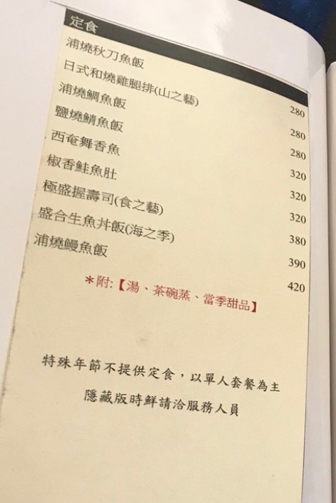 點了時令定食套餐,菜單上為380元,點餐時服務員只告知主餐是香魚,結帳後才發現改收420元,跟服務員反應後,服務員態度極差,說她點餐時就有告知因為是”野生”香魚所以要加價,我們一行六人在點餐時沒有任何人聽見要加價,且菜單上也無備註浮動價或時令價,讓人難以接受,且事後服務員態度惡劣,不會再去了。