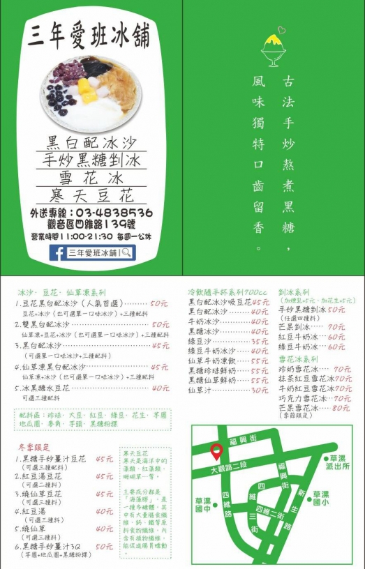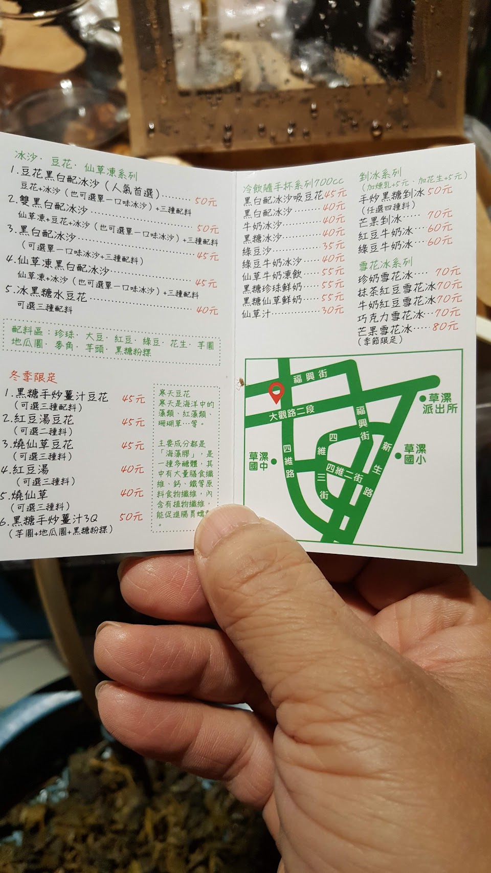 謝謝google map, 到當地查到評價不錯的冰店, 就順便繞過去, 果真非常滿意, 不算大的店開在很不起眼的街邊, 但冰品跟豆花非常好吃, 第一口就感覺到豆花的豆香很明顯, 今天點了黑白配的冰品是雪花冰跟黑糖挫冰各一半, 甜度及配料品質都很高, 推薦店家自製的黑糖粉粿, 喜歡粉粿的可以試試看, 喜歡店裡的裝潢非常符合店名, 如果還有機會到草漯會再去光臨。
