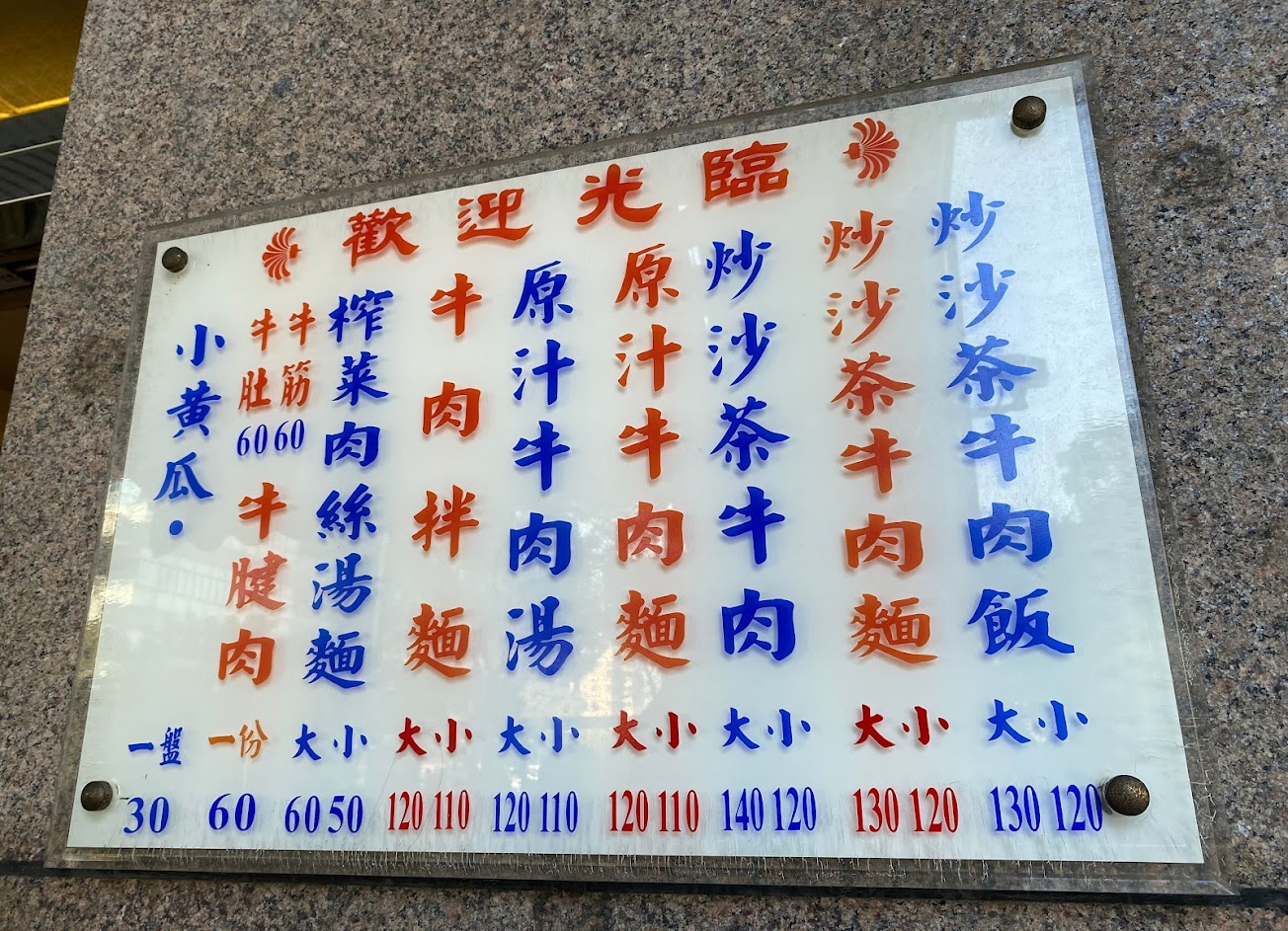 吃起來感覺算是普通的牛肉麵,不過生意非常好,個人覺得菜單上沒有寫價錢不太方便,只有外牆上貼著價目表就要去外面看才知道價格。