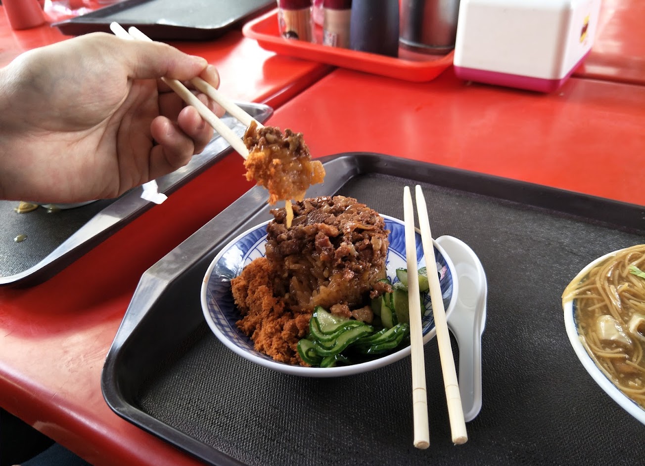 米糕一上桌香氣撲鼻而來,米飯有被烹調的入味,吃起來口感Q軟,不管是直接享用或是搭配小黃瓜以及肉鬆,吃起來都有不同的層次感,另外小黃瓜以及肉鬆給的超級大方,幾乎可以每一口都搭配到配料,吃得很過癮。
