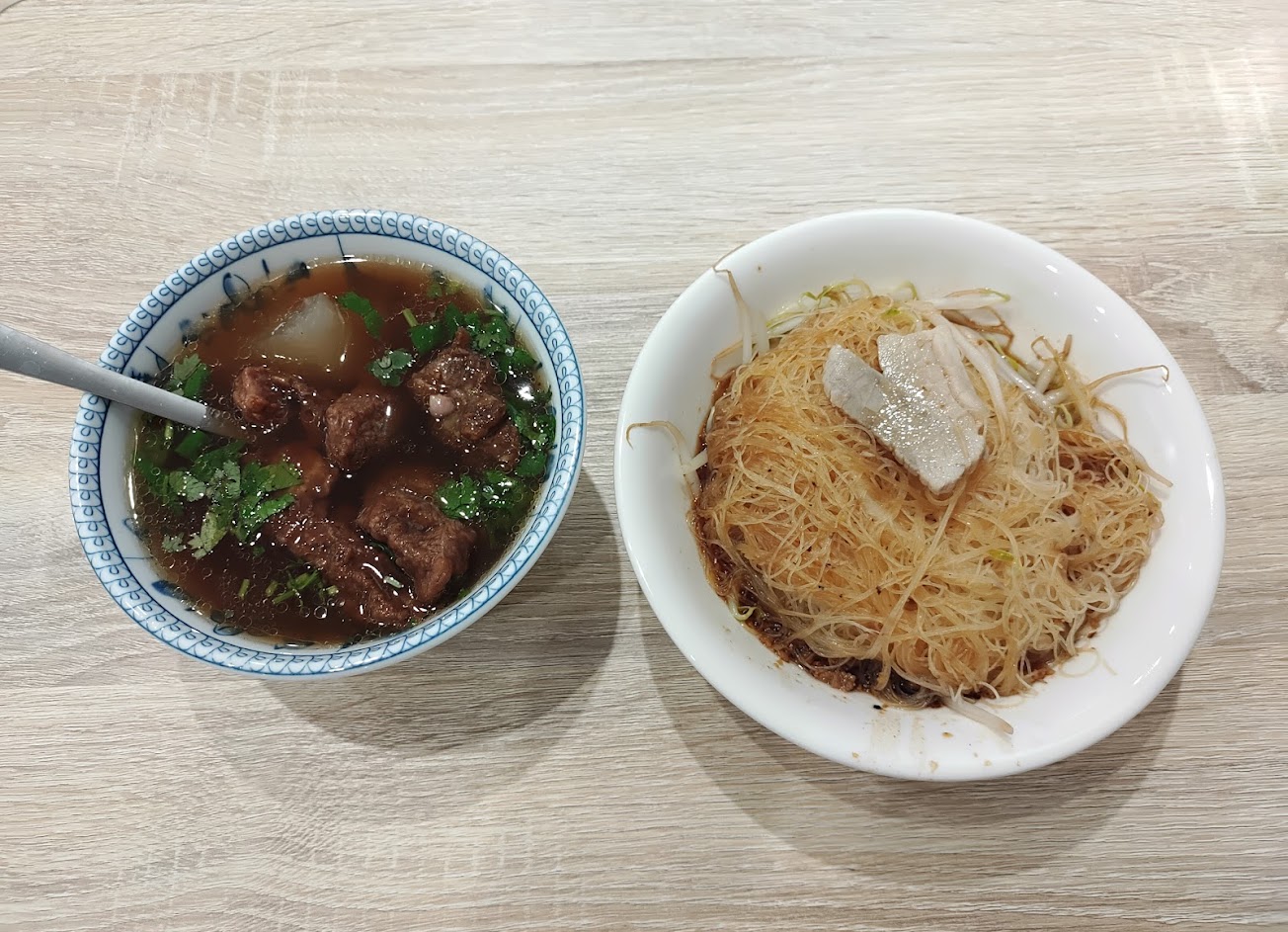 排骨酥湯帶有濃濃的芋頭香,乾米粉是拌肉燥的古早味,好吃。店內用餐區明亮乾淨,店家的料理區也很乾淨衛生。