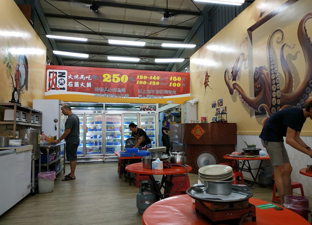 想吃烤肉又不想花太多錢的話來這裡是一個不錯的選擇,這裡吃的東西種類蠻多樣化了像有鮭魚蛤蠣牛肉豬肉雞肉那肉類有分有醃漬過的跟沒有醃漬可以放在火鍋裡面的,有一樣是焗烤的蝦子那個很好吃然後它有好幾種烤箱可以烤來吃的東西那幅人也相當貼心都會主動來詢問要不要換烤紙,在這裡的話兩個人以上一個人都是$250,那如果是一個人來由於開鍋費所以會收$280,不過一個人吃有點無聊,還是建議帶朋友或家人一起來比較好玩。 另外牆壁上的3D壁畫蠻漂亮的,空間也很寬敞乾淨,桌椅也有固定在清潔。很推薦的一家店
