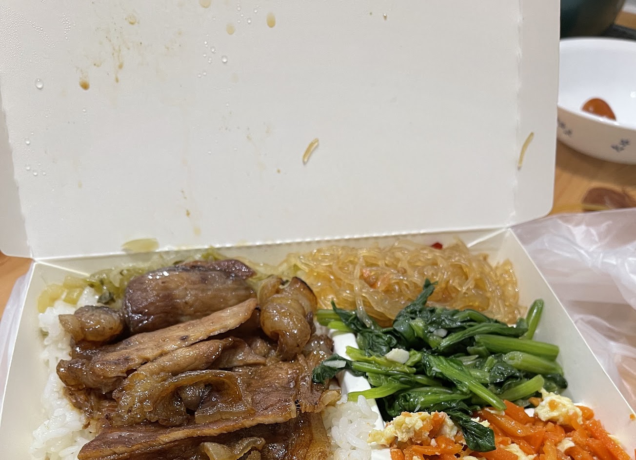 今天叫外送,菜色茄子、麵筋、苦瓜,這個配色再配上燒肉的顏色,根本是一坨⋯