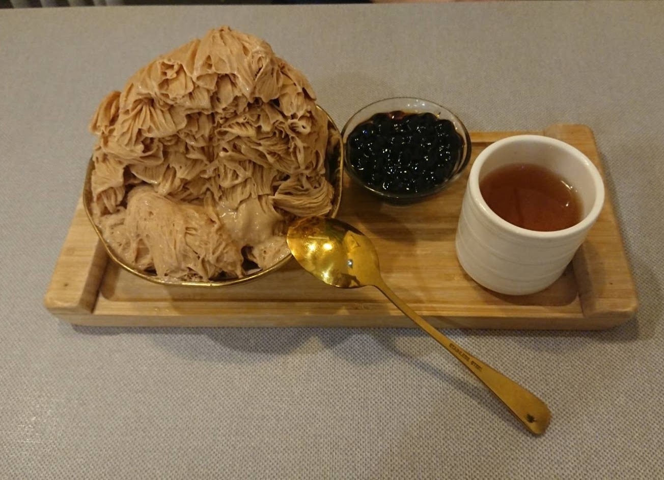 魚池奶茶雪花冰茶味濃厚,像真的在喝奶茶一樣,搭配的蜂蜜珍珠十分Q,甜度適中,挖一口冰配幾顆珍珠,超享受❤️~不過要注意珍珠最好不要整個倒在冰上,口感會容易硬掉。