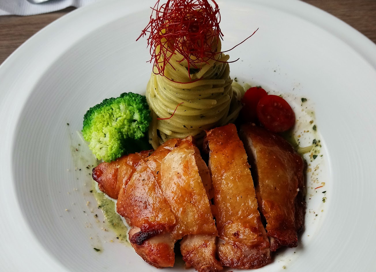 餐點選擇多樣化, 無論喜歡吃麵或飯, 甜或鹹, 都可以找到喜愛的選項。擺盤澎湃誘人, 濃湯, 麵包是小朋友會喜歡的口味, 義大利麵的醬汁如果再多一些會更好, 燉飯滋味很足, 雖然米心都煮透了, 可以理解是為了入境隨俗。蒜頭雞鍋的雞肉有些許肉腥味, 麻辣滋味十足, 表現良好。甜點舒芙蕾無論是盤飾, 份量, 醬汁, 主題性, 都是滿分, 非常吸睛, 令人回味。