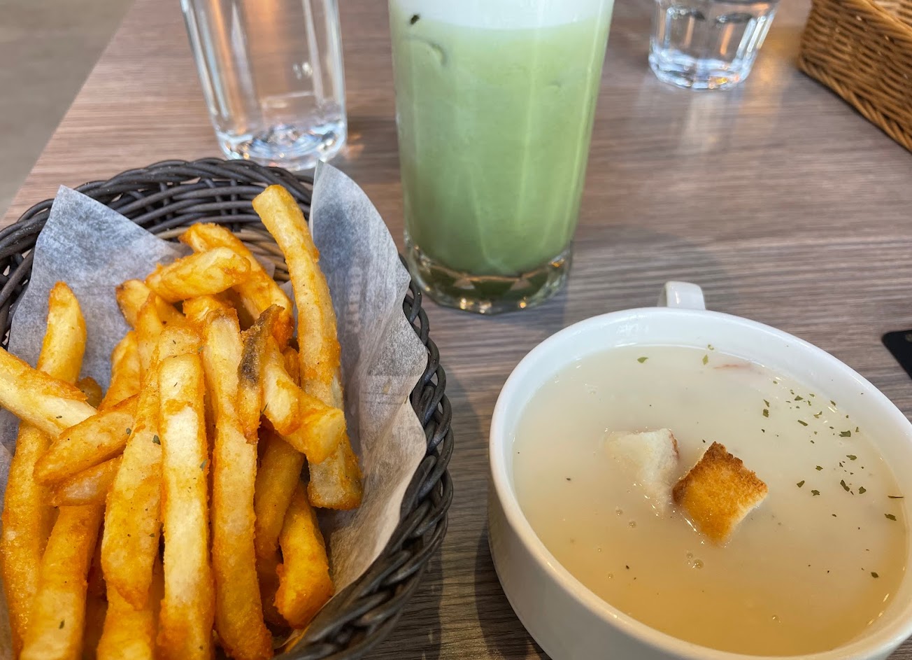 建議搭個套餐,更有飽足感,享受其他甜點、小點等等。上次享用過布丁,這次就先skip了。飲品這次選奶蓋紅,鹹鹹的海鹽配上綿密的奶香和紅茶真的很搭。薯條趁熱吃最好吃。湯品像牛肉番茄湯,味道足夠,不錯喝。