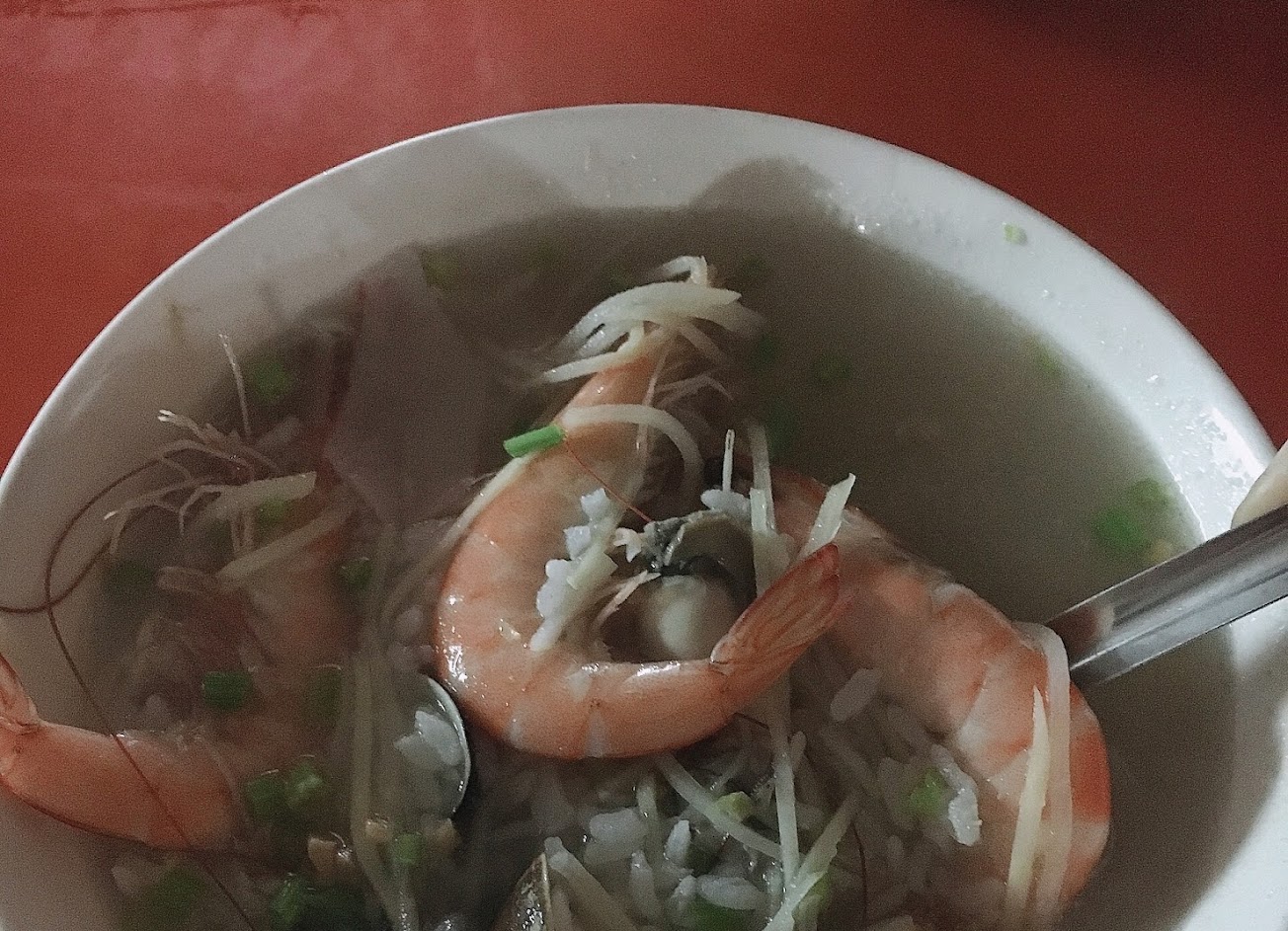 超新鮮的海產粥、泡麵,推薦加點一份鹽蒸蝦,好吃。