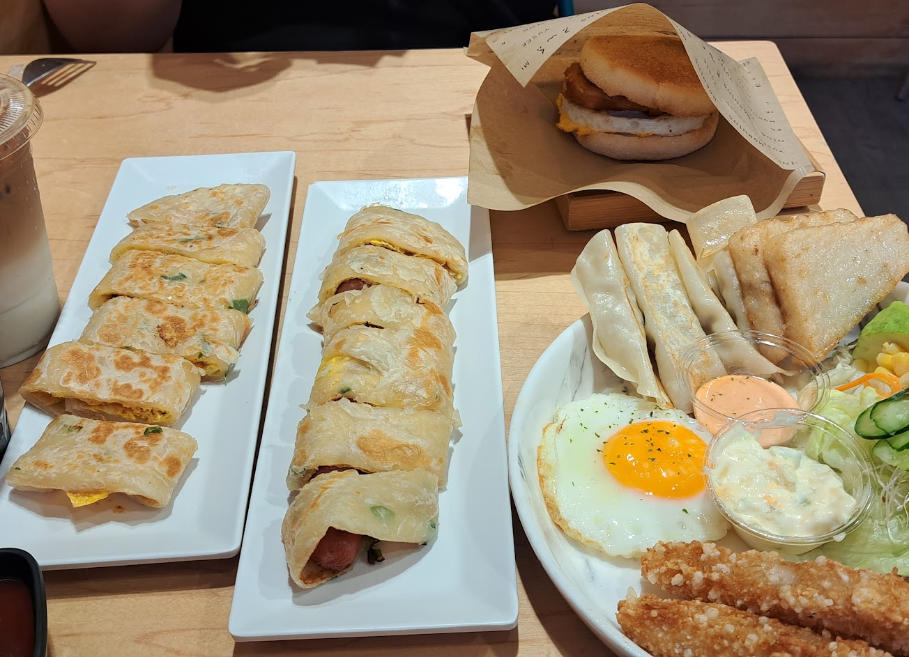 蔬菜蛋餅還不錯吃、希望醬料讓客人自己選擇不要直接淋在上面,沙拉吃的很滿足但裝的碗實在是太小了,疊的就像八寶冰這麼高食用時很難不掉的餐盤都是蘿蔔絲…還有點餐的小姐叫我確認餐點時多打了一個沒人點的餐點,自己沒有確認好還讓客人發現,而且也沒什麼表示抱歉!覺得環境還不錯但服務人員不管是臉上還是整體都沒有一般早餐店態度來的正常親切,覺得很怪也很可惜!