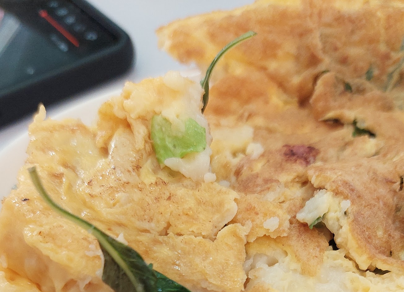 蛋餅很大一份,沒有蔥,夾著滿滿的九層塔,很香好吃。